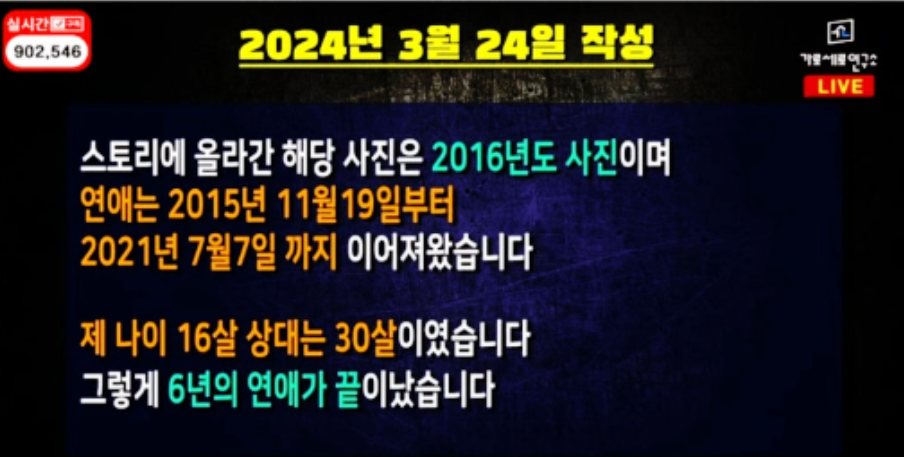 가세연은 김새론의 이모와의 전화 통화 내용, 그리고 생전 김새론이 남겼다는 입장문을 공개하며 두 사람이 6년간 연인 관계였다고 주장했다.