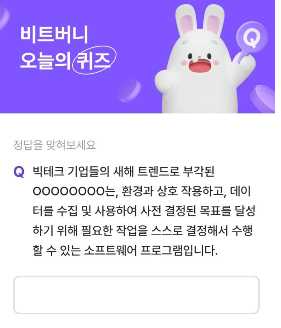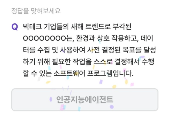 #2월7일 출제된 비트버니퀴즈는 " 빅테크 기업들의 새해 트렌드로 부각된 OOOOOOOO는, 환경과 상호 작용하고, 데이 터를 수집 및 사용하여 사전 결정된 목표를 달성 하기 위해 필요한 작업을 스스로 결정해서 수행 할 수 있는 소프트웨어 프로그램입니다"